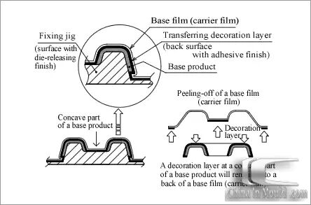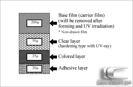 一种是需要裁切的方式,也是目前做得最多的一种,运用无真空孔之真空成形(NGF成形)技术, 透过大气压或真空压,将涂有黏着剂之薄膜与加工对象紧密贴附。