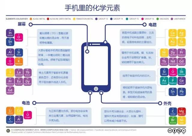 把手机拆开看不是什么新鲜事情了。 2今天我们会看得更深入智能手机主要部件包括电池,屏幕,内部电路和外壳这四个主要部分。 一款智能手机通常含有41种化学元素。每个部件都包含哪些元素,这些元素的分布和分工,见下图: 图片来源:compoundchem(材料馆编译,转载注明出处) 屏幕氧化铟锡(ITO)是氧化铟和氧化锡的混合物...