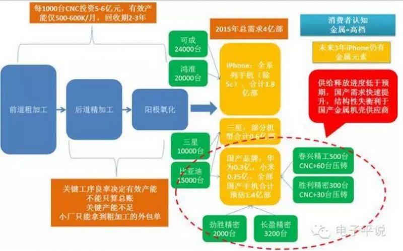 行业机遇:国内品牌大规模导入金属机壳。智能机多核大屏化已接近极限,必须谋求外观差异化,以目前能见度判断,2017年之前的iPhone都会保留金属元素。预计2017年全球智能终端金属件市场183亿美元,复合增速20%,华为、小米、OPPO,ViVO都有望在2015年大规模启动金属机壳,使得国内金属机壳的渗透率从2014年5-10%,提升到15-2...