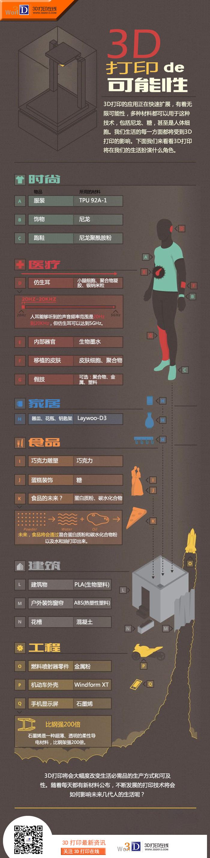 “一图看懂3d打印的可能性”将向你展示3D打印的所有可能性,并一一细数可以用于3D打印的材料。3D打印技术将大大改变多个市场的面貌。通常人们听到3D打印就会想到塑料或者金属这些打印材料。但接下来的这张信息图将会告诉你,其实有很多种材料都可以用于3D打印机的。