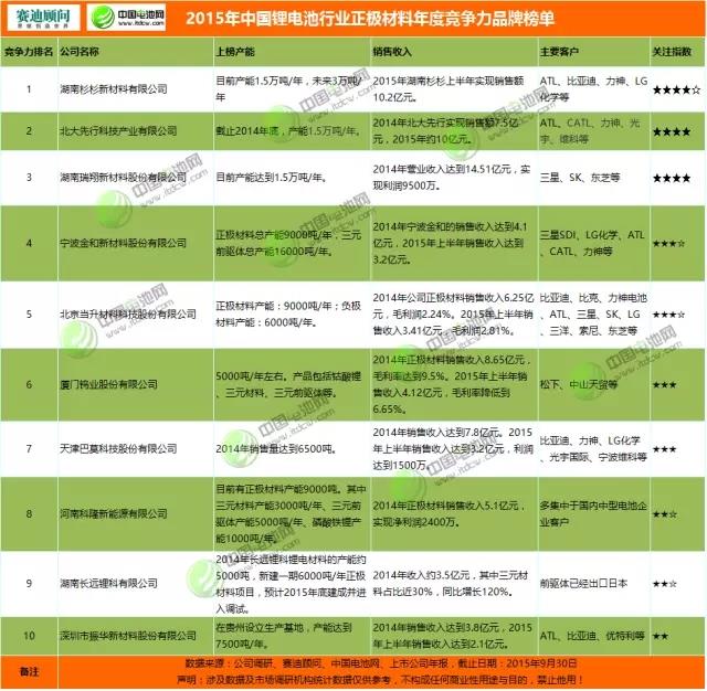 竞争力榜单是根据我国动力锂电池及其产业链公司的产能数据、客户分布、公司情况、诚信形象、品牌口碑等综合评判指标得出,数据来源为公司实地调研、机构数据、上市公司披露年季报表、电话访谈(数据统计截止到2015年9月30日,仅供参考)。上榜企业由赛迪顾问锂电产业研究小组进行了专家点评。 中国电池杂志-中国电池网10月10...