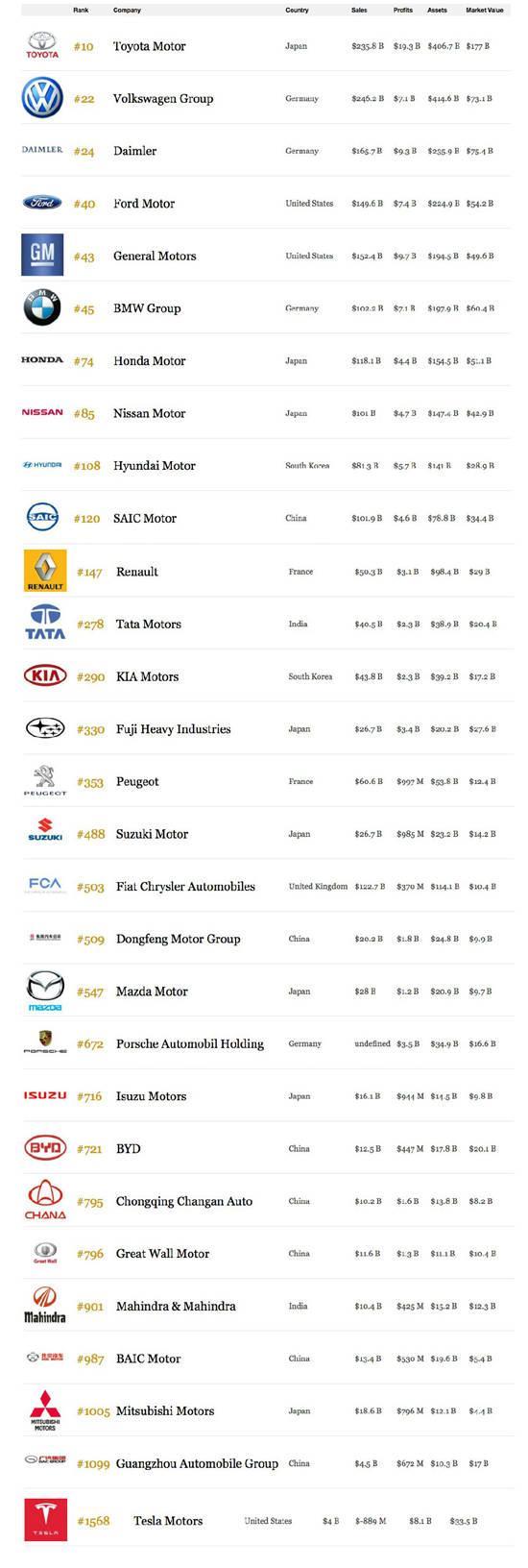 根据最新发布的《2016年福布斯全球企业2000强》榜单,在众多车企中,表现最抢眼的当属丰田,其以2358亿美元的年销售额和193亿美元的利润,稳坐车企一哥的交椅,而在全球企业总排名中位列第十。上榜的中国汽车公司则比去年少了一家。华晨落榜,但七家上榜车企中有五家名次大幅上升。 29家上榜车企如下所示: 1.丰田;2....