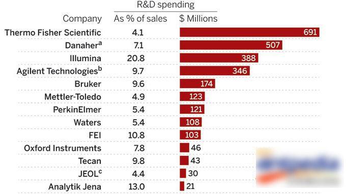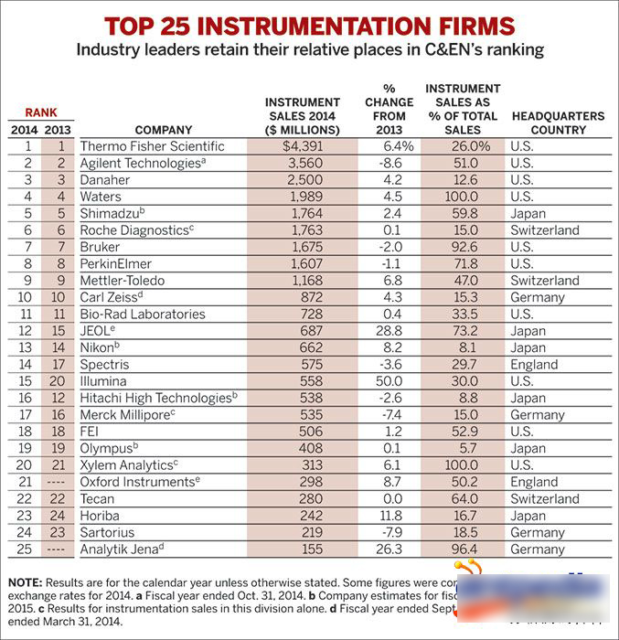 2015年4月27日, 2014年全球仪器公司最新排名出炉,前三位的企业仍然保持去年的领先位置,之后8家企业排名也没有变化;牛津仪器(第21位)和耶拿分析(第25位)首次入该榜;2013年排名第13位的德国Eppendorf公司,由于今年没有及时报告数据,故未进入前25位排名,去年第25位的Qiagen今年亦落榜。排名依次为:赛默飞第1位(去...