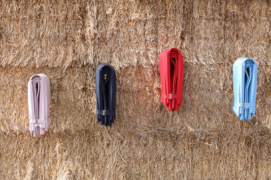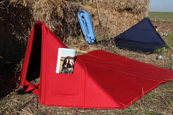 这真是个让人欢喜的设计,说它是后备箱必备可真不过分,如果能买到的话(暂时还未量产)~ 它折叠起来就像一块毛毯,展开铺到地上将一头的带子扣紧,就可以变成一个带靠背的躺椅垫。嗯,很适合带着它和她回外婆家一起,到村头土坡上看日落…
