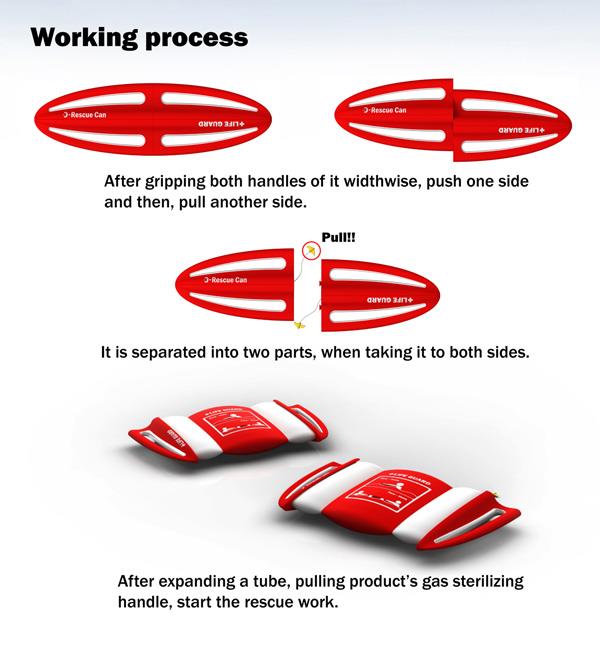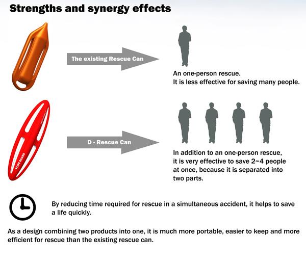 救生用具。很多救生用具不能同时救助多个人。D-Rescue是一个橄榄球形状的产品,扔进水里后会分离成两块形状,可以多一个人使用。减少救助时间和拯救生命。