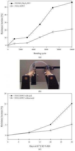 (a)图为ITO/SiO2/Nb2O5/PET和ITO/L/H/PET衬底的电阻增加百分比对弯曲周期的函数图像;(b)最小宽度为40mm的ITO/L/H/PET 衬底的弯曲测试实验照片;(c) 分别通过有酸和无酸工艺制备的ITO/L/H/PET衬底的电阻增加百分比对持续时间的函数图像,反应室内维持85°C的温度和85%的相对湿度。材料人网注: 研究人员找到一种制备由无...